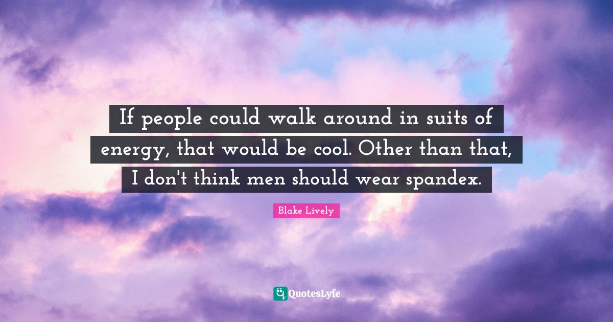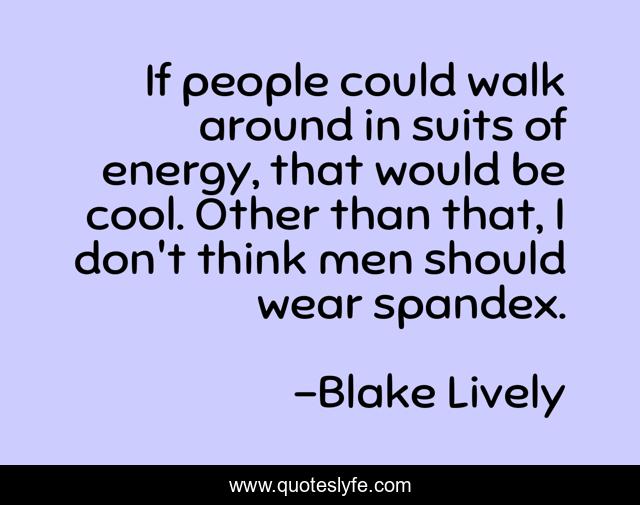 This page presents the quote "If people could walk around in suits of energy, that would be cool. Other than that, I don't think men should wear spandex.". Author of this quote is Blake Lively. This quote is about walk, men, people,.
