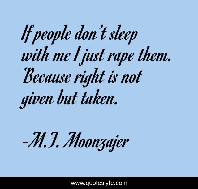 This page presents the quote "If people don’t sleep with me I just rape them. Because right is not given but taken.". Author of this quote is M.F. Moonzajer. This quote is about taken, given, sleep, rape,.