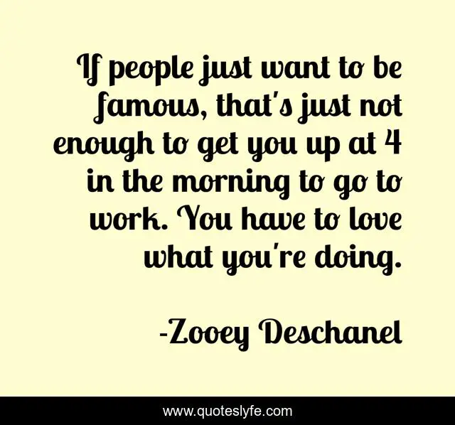 This page presents the quote "If people just want to be famous, that's just not enough to get you up at 4 in the morning to go to work. You have to love what you're doing.". Author of this quote is Zooey Deschanel. This quote is about work, love, affection, morning,.