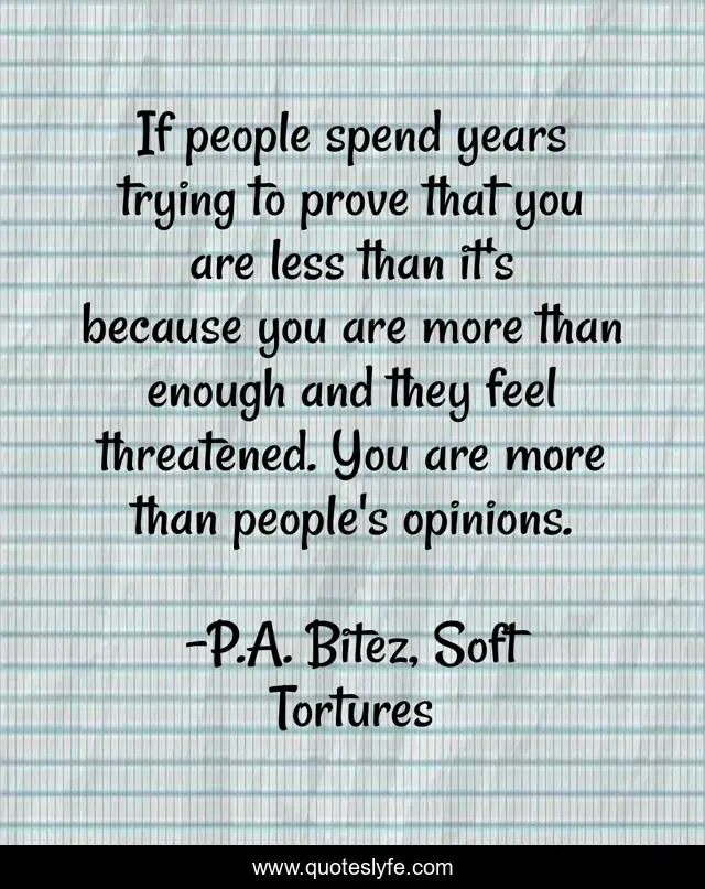 This page presents the quote "If people spend years trying to prove that you are less than it's because you are more than enough and they feel threatened. You are more than people's opinions.". Author of this quote is P.A. Bitez, Soft Tortures. This quote is about opinions, self-esteem, inspirational, enthusiasm,.