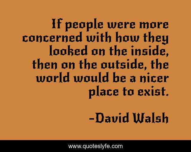 This page presents the quote "If people were more concerned with how they looked on the inside, then on the outside, the world would be a nicer place to exist.". Author of this quote is David Walsh. This quote is about existence, peace, exist, inner-beauty,.