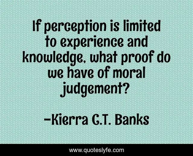 This page presents the quote "If perception is limited to experience and knowledge, what proof do we have of moral judgement?". Author of this quote is Kierra C.T. Banks. This quote is about love, reflection, peace, journey, qoutes, grace, affection, thoughtfulness,.