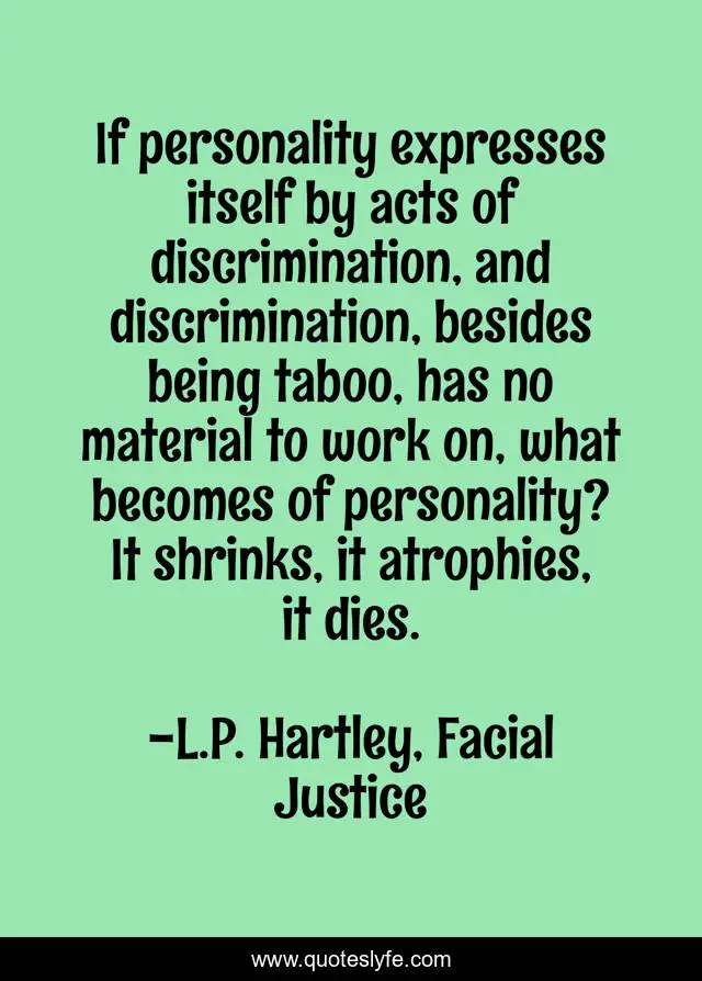 This page presents the quote "If personality expresses itself by acts of discrimination, and discrimination, besides being taboo, has no material to work on, what becomes of personality? It shrinks, it atrophies, it dies.". Author of this quote is L.P. Hartley, Facial Justice. This quote is about comparison, discrimination, personality,.