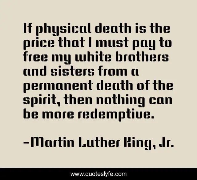 This page presents the quote "If physical death is the price that I must pay to free my white brothers and sisters from a permanent death of the spirit, then nothing can be more redemptive.". Author of this quote is Martin Luther King, Jr.. This quote is about nothing, price, free,.