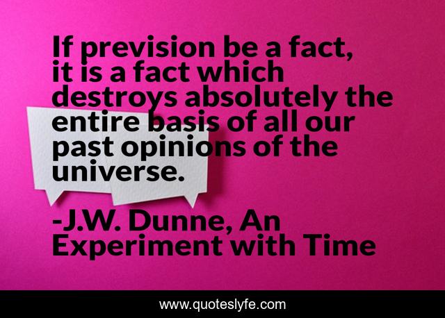 This page presents the quote "If prevision be a fact, it is a fact which destroys absolutely the entire basis of all our past opinions of the universe.". Author of this quote is J.W. Dunne, An Experiment with Time. This quote is about precognition, time, prevision, universe,.