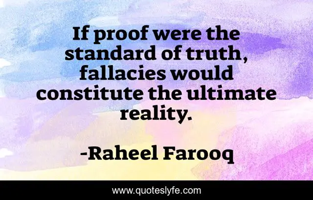 This page presents the quote "If proof were the standard of truth, fallacies would constitute the ultimate reality.". Author of this quote is Raheel Farooq. This quote is about fallacy, epistemology, logical-fallacies, standard-of-truth, ultimate-reality, philosophy, empiricism, evidence, logical-positivism,.