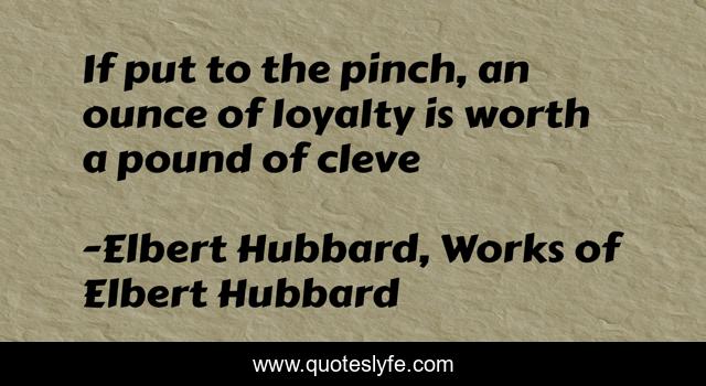 This page presents the quote "If put to the pinch, an ounce of loyalty is worth a pound of cleve". Author of this quote is Elbert Hubbard, Works of Elbert Hubbard. This quote is about cleverness, loyalty,.