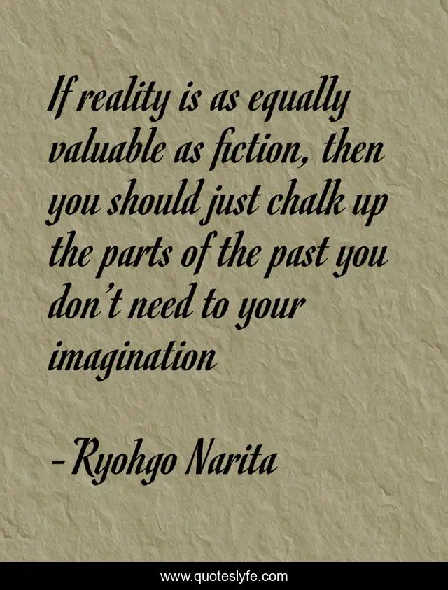 This page presents the quote "If reality is as equally valuable as fiction, then you should just chalk up the parts of the past you don’t need to your imagination". Author of this quote is Ryohgo Narita. This quote is about imagination, erika, durarara, fiction,.