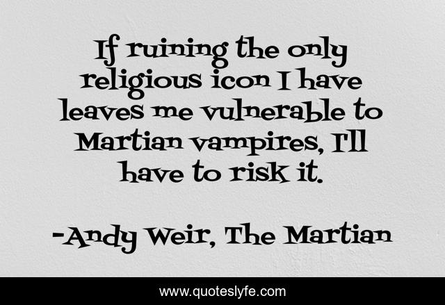 This page presents the quote "If ruining the only religious icon I have leaves me vulnerable to Martian vampires, I'll have to risk it.". Author of this quote is Andy Weir, The Martian. .