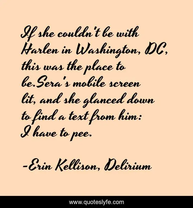 This page presents the quote "If she couldn't be with Harlen in Washington, DC, this was the place to be.Sera's mobile screen lit, and she glanced down to find a text from him: I have to pee.". Author of this quote is Erin Kellison, Delirium. This quote is about urban-fantasy, paranormal,.