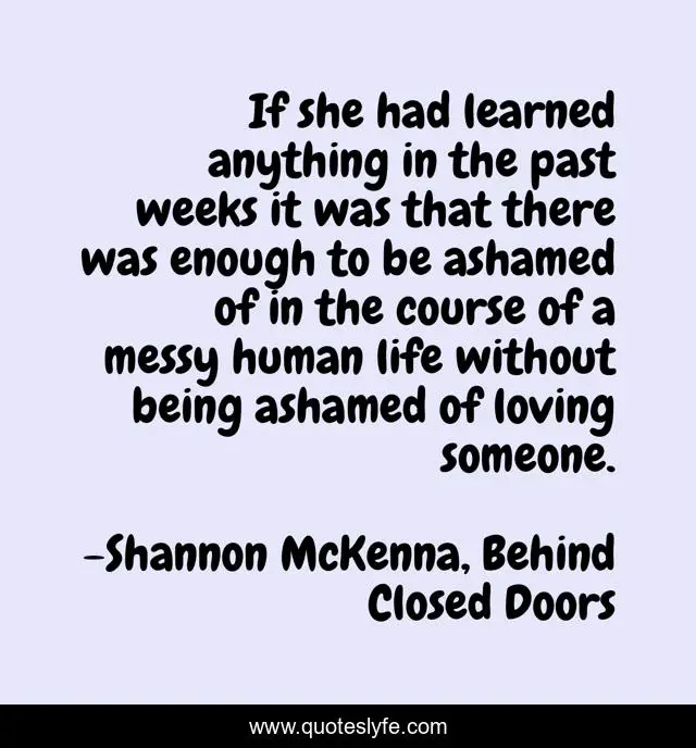 This page presents the quote "If she had learned anything in the past weeks it was that there was enough to be ashamed of in the course of a messy human life without being ashamed of loving someone.". Author of this quote is Shannon McKenna, Behind Closed Doors. This quote is about romance, love, affection,.
