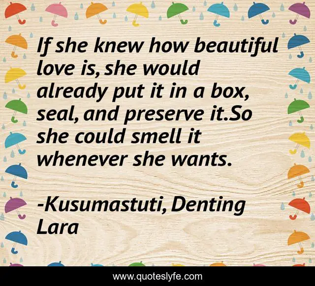 This page presents the quote "If she knew how beautiful love is, she would already put it in a box, seal, and preserve it.So she could smell it whenever she wants.". Author of this quote is Kusumastuti, Denting Lara. This quote is about beautiful, box, love, preserve, she, seal, put, smell, affection,.