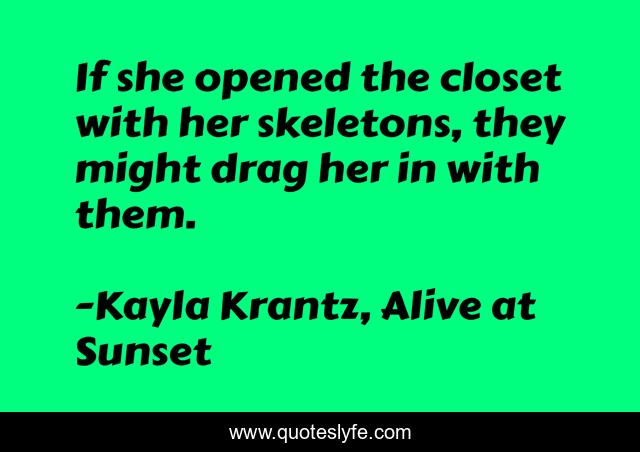 This page presents the quote "If she opened the closet with her skeletons, they might drag her in with them.". Author of this quote is Kayla Krantz, Alive at Sunset. This quote is about lie, life, trapped, past, haunted, skeletons, history,.
