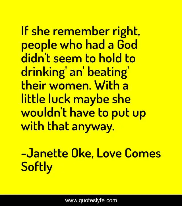 This page presents the quote "If she remember right, people who had a God didn't seem to hold to drinking' an' beating' their women. With a little luck maybe she wouldn't have to put up with that anyway.". Author of this quote is Janette Oke, Love Comes Softly. This quote is about christian, love, affection,.