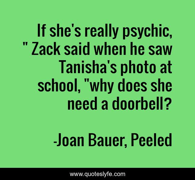 This page presents the quote "If she's really psychic, " Zack said when he saw Tanisha's photo at school, "why does she need a doorbell?". Author of this quote is Joan Bauer, Peeled. This quote is about precognition, irony,.