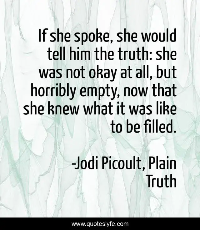 This page presents the quote "If she spoke, she would tell him the truth: she was not okay at all, but horribly empty, now that she knew what it was like to be filled.". Author of this quote is Jodi Picoult, Plain Truth. This quote is about mystery, amish, love, plain-truth, fiction, drama, novel, empty, truth,.
