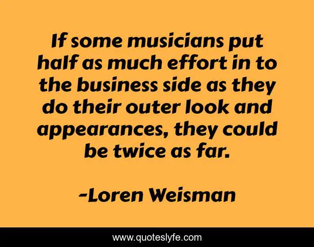 This page presents the quote "If some musicians put half as much effort in to the business side as they do their outer look and appearances, they could be twice as far.". Author of this quote is Loren Weisman. This quote is about fashion, business, appearances, drive, work-ethic, musicians, determination, looks,.