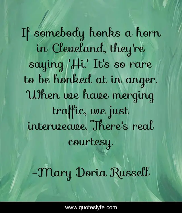 This page presents the quote "If somebody honks a horn in Cleveland, they're saying 'Hi.' It's so rare to be honked at in anger. When we have merging traffic, we just interweave. There's real courtesy.". Author of this quote is Mary Doria Russell. This quote is about saying, courtesy, traffic,.
