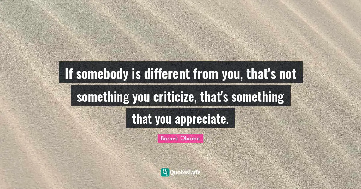 This page presents the quote "If somebody is different from you, that's not something you criticize, that's something that you appreciate.". Author of this quote is Barack Obama. This quote is about criticize, different, appreciate,.