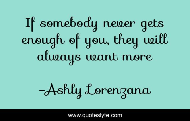 This page presents the quote "If somebody never gets enough of you, they will always want more". Author of this quote is Ashly Lorenzana. This quote is about desire, enigmatic, love, relationships, attraction, infatuation, scarcity, affection,.