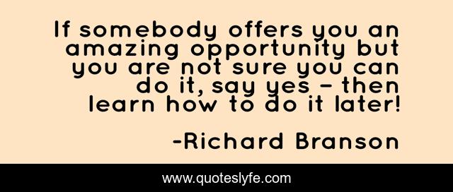 This page presents the quote "If somebody offers you an amazing opportunity but you are not sure you can do it, say yes – then learn how to do it later!". Author of this quote is Richard Branson. This quote is about fake-it-till-you-make-it, yes, opportunity, opportunity-knocks, learning-by-doing,.