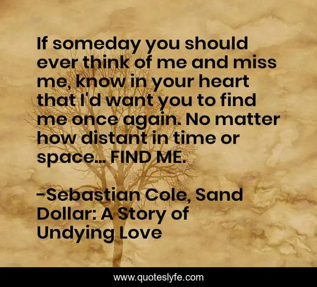 This page presents the quote "If someday you should ever think of me and miss me, know in your heart that I'd want you to find me once again. No matter how distant in time or space... FIND ME.". Author of this quote is Sebastian Cole, Sand Dollar: A Story of Undying Love. This quote is about love, tearjerker, fiction, romance, fantasy, love-story, affection,.
