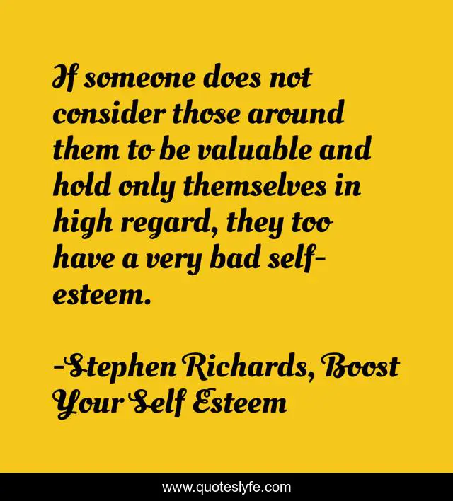 This page presents the quote "If someone does not consider those around them to be valuable and hold only themselves in high regard, they too have a very bad self-esteem.". Author of this quote is Stephen Richards, Boost Your Self Esteem. This quote is about wealth-creation, money, mind-body-spirit, optimistic, self-help, confidence, wealth, self-help-book, positive,.