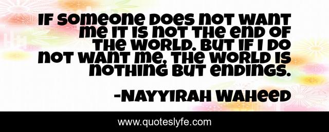 This page presents the quote "If someone does not want me it is not the end of the world. But if I do not want me, the world is nothing but endings.". Author of this quote is Nayyirah Waheed. This quote is about lessons, life, love, self, perspective, inspirational, thoughts, enthusiasm, affection,.