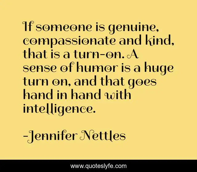 This page presents the quote "If someone is genuine, compassionate and kind, that is a turn-on. A sense of humor is a huge turn on, and that goes hand in hand with intelligence.". Author of this quote is Jennifer Nettles. This quote is about intelligence, kind,.