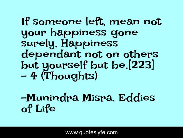 This page presents the quote "If someone left, mean not your happiness gone surely, Happiness dependant not on others but yourself but be.[223] - 4 (Thoughts)". Author of this quote is Munindra Misra, Eddies of Life. This quote is about happiness, thoughts,.