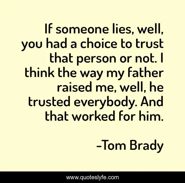 This page presents the quote "If someone lies, well, you had a choice to trust that person or not. I think the way my father raised me, well, he trusted everybody. And that worked for him.". Author of this quote is Tom Brady. This quote is about me, father, choice,.
