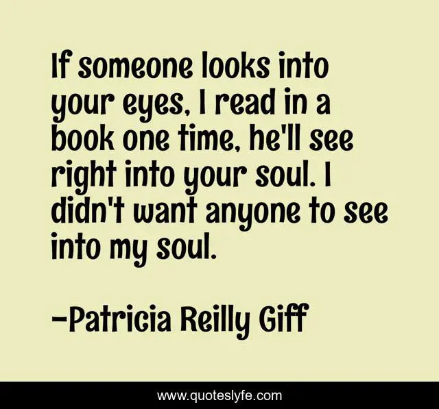 This page presents the quote "If someone looks into your eyes, I read in a book one time, he'll see right into your soul. I didn't want anyone to see into my soul.". Author of this quote is Patricia Reilly Giff. This quote is about seeing, eyes, humans, soul, books, fear,.