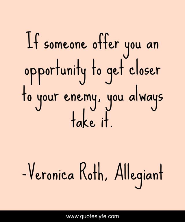 This page presents the quote "If someone offer you an opportunity to get closer to your enemy, you always take it.". Author of this quote is Veronica Roth, Allegiant. This quote is about tris, strategy,.