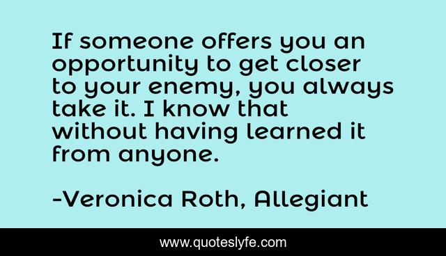 This page presents the quote "If someone offers you an opportunity to get closer to your enemy, you always take it. I know that without having learned it from anyone.". Author of this quote is Veronica Roth, Allegiant. This quote is about enemy, veronica, allegiant, wisdom, roth, divergent-3, divergent-series, opportunity, veronica-roth,.