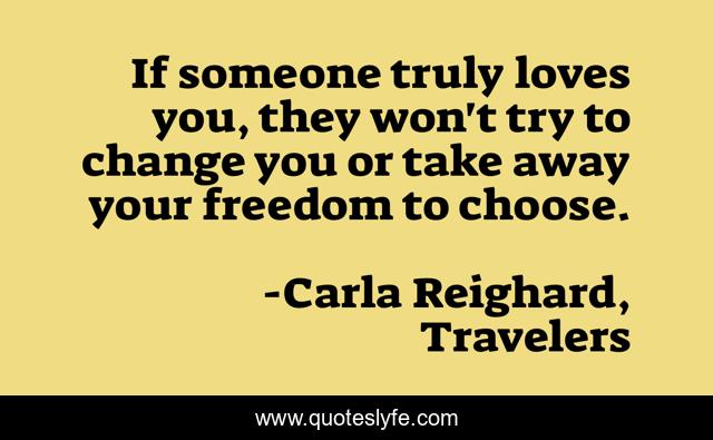 This page presents the quote "If someone truly loves you, they won't try to change you or take away your freedom to choose.". Author of this quote is Carla Reighard, Travelers. This quote is about fantasy, love, affection,.