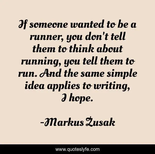 This page presents the quote "If someone wanted to be a runner, you don't tell them to think about running, you tell them to run. And the same simple idea applies to writing, I hope.". Author of this quote is Markus Zusak. This quote is about confidence, the-guardian, positive, motivational, idea, rule, writing, optimistic, interview,.