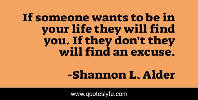 This page presents the quote "If someone wants to be in your life they will find you. If they don't they will find an excuse.". Author of this quote is Shannon L. Alder. This quote is about anxiety, lack-of-faith, excuses, confusion, indecision, excuse, guilt, find-you, fear,.