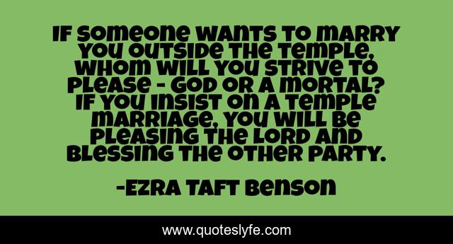 This page presents the quote "If someone wants to marry you outside the temple, whom will you strive to please - God or a mortal? If you insist on a temple marriage, you will be pleasing the Lord and blessing the other party.". Author of this quote is Ezra Taft Benson. This quote is about god, blessing, party,.