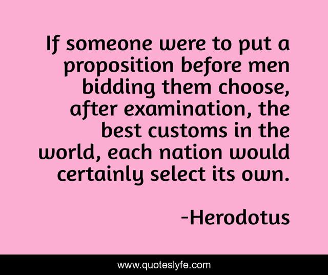 This page presents the quote "If someone were to put a proposition before men bidding them choose, after examination, the best customs in the world, each nation would certainly select its own.". Author of this quote is Herodotus. This quote is about world, men, nation,.