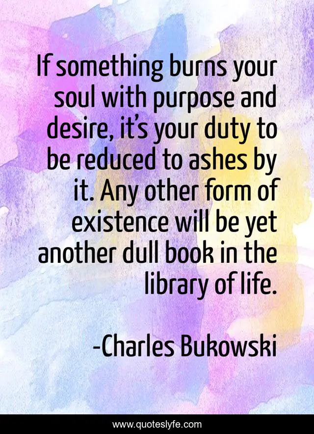 This page presents the quote "If something burns your soul with purpose and desire, it’s your duty to be reduced to ashes by it. Any other form of existence will be yet another dull book in the library of life.". Author of this quote is Charles Bukowski. This quote is about existence, passion, inspiration,.
