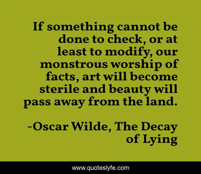 This page presents the quote "If something cannot be done to check, or at least to modify, our monstrous worship of facts, art will become sterile and beauty will pass away from the land.". Author of this quote is Oscar Wilde, The Decay of Lying. .
