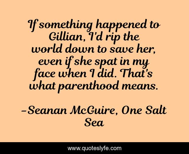 This page presents the quote "If something happened to Gillian, I'd rip the world down to save her, even if she spat in my face when I did. That's what parenthood means.". Author of this quote is Seanan McGuire, One Salt Sea. This quote is about parenthood, motherhood, parenting,.