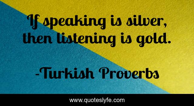 This page presents the quote "If speaking is silver, then listening is gold.". Author of this quote is Turkish Proverbs. This quote is about gold, listening, speaking, silver,.
