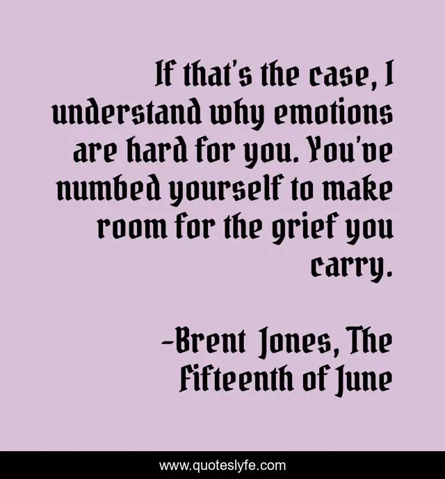 This page presents the quote "If that’s the case, I understand why emotions are hard for you. You’ve numbed yourself to make room for the grief you carry.". Author of this quote is Brent Jones, The Fifteenth of June. This quote is about relationships, loss, life, death, knowledge, destructive-relationships, acceptance, wisdom, grief,.
