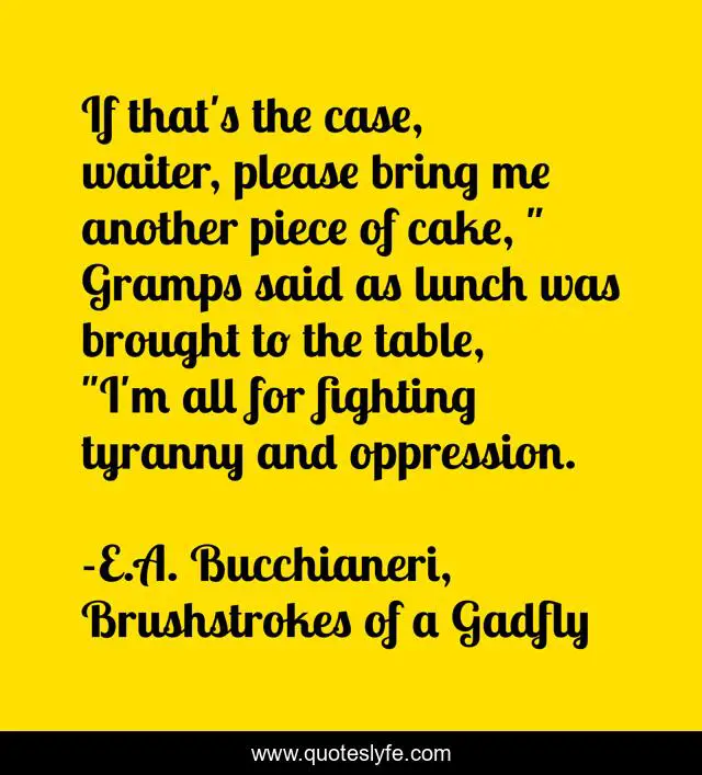 This page presents the quote "If that's the case, waiter, please bring me another piece of cake, " Gramps said as lunch was brought to the table, "I'm all for fighting tyranny and oppression.". Author of this quote is E.A. Bucchianeri, Brushstrokes of a Gadfly. This quote is about tyranny, funny, crashing-your-diet, foodie, fighting-tyranny, rights, food, dessert, fighting-for-your-right,.