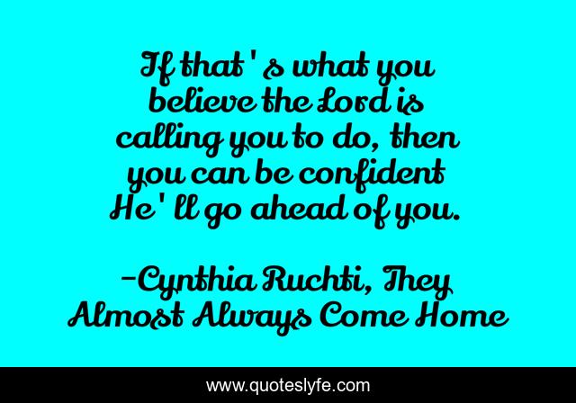 This page presents the quote "If that's what you believe the Lord is calling you to do, then you can be confident He'll go ahead of you.". Author of this quote is Cynthia Ruchti, They Almost Always Come Home. .