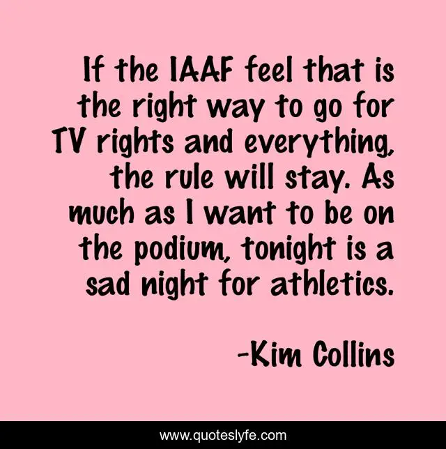This page presents the quote "If the IAAF feel that is the right way to go for TV rights and everything, the rule will stay. As much as I want to be on the podium, tonight is a sad night for athletics.". Author of this quote is Kim Collins. This quote is about night, rights,.