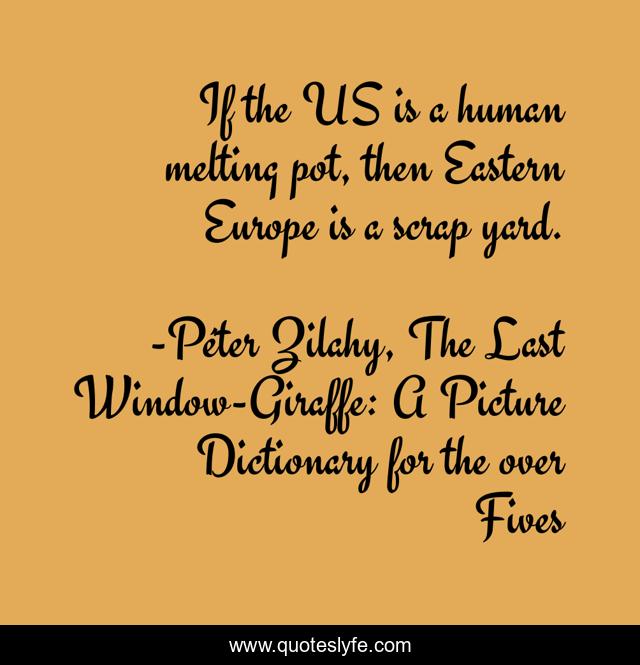 This page presents the quote "If the US is a human melting pot, then Eastern Europe is a scrap yard.". Author of this quote is Péter Zilahy, The Last Window-Giraffe: A Picture Dictionary for the over Fives. This quote is about dark-humour, novel, central-europe, dictatorship,.