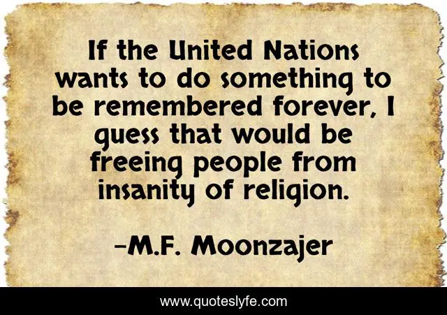 This page presents the quote "If the United Nations wants to do something to be remembered forever, I guess that would be freeing people from insanity of religion.". Author of this quote is M.F. Moonzajer. This quote is about forever, insanity, atheism, religion, the-united-nations, un,.