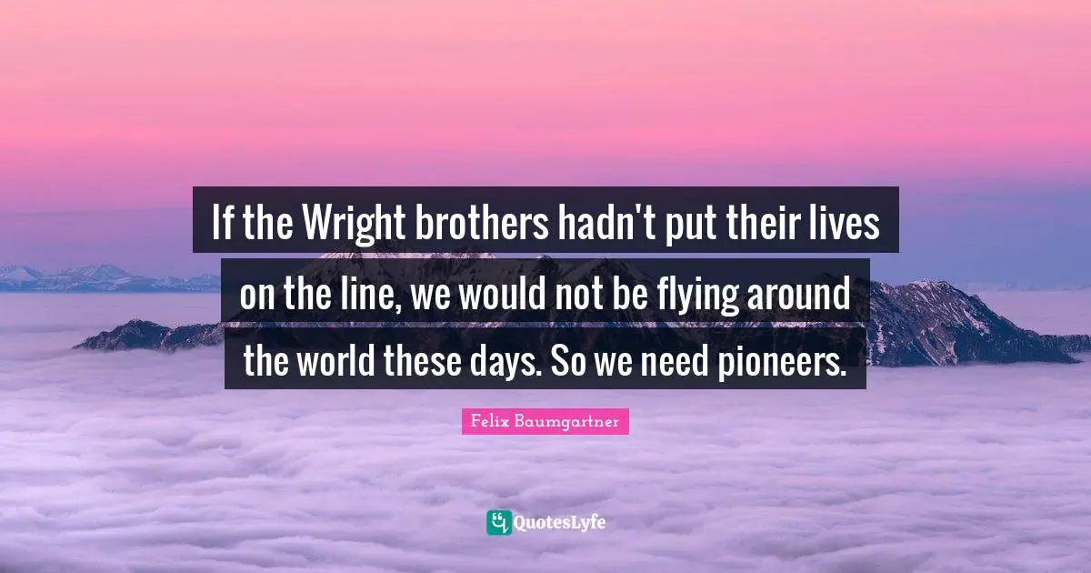This page presents the quote "If the Wright brothers hadn't put their lives on the line, we would not be flying around the world these days. So we need pioneers.". Author of this quote is Felix Baumgartner. This quote is about these days, brother, flying, around the world, pioneers,.